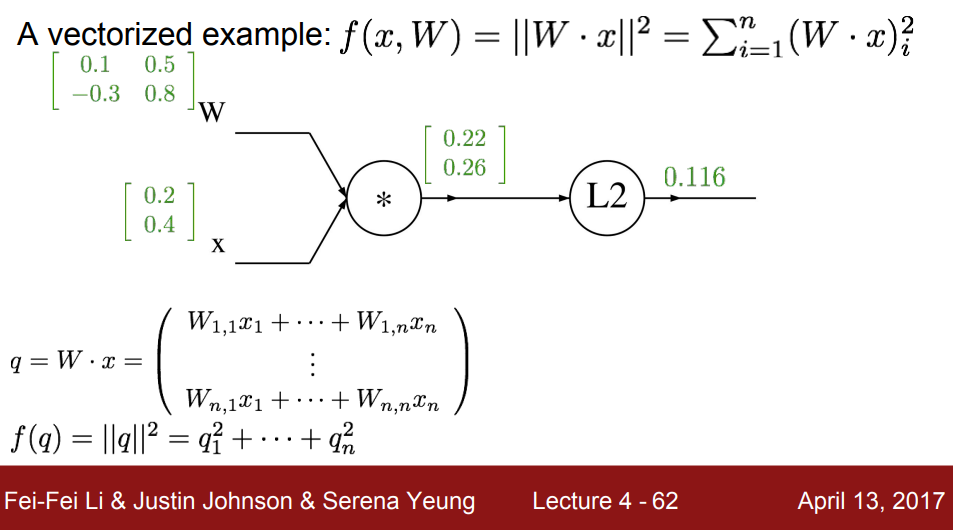 위와 같은 그래프가 있을 때, Vector들의 Backpropagation은 어떻게 진행되는지 살펴보자. 우선 첫 번째 *연산에 대한 식은 좌측 하단에 q로 나타나있고, L2에 대한 식은 f(q)로 나타나있다.