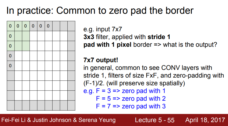 사람들은 input image의 가장자리에 0을 채워서 사이즈를 인위적으로 늘려주기도 한다. 이를 zero-padding이라 하는데, padding을 하는 이유는 다음과 같다.