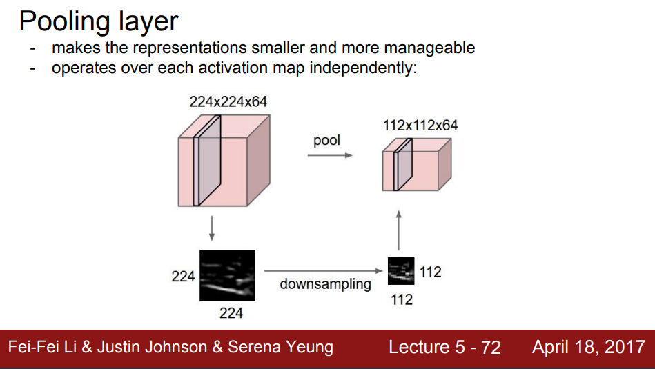 Pooling은 슬라이드에서 보는 것처럼 이미지의 사이즈를 줄이는(downsampling)역할을 한다. 이에 따른 효과는 다음과 같다.