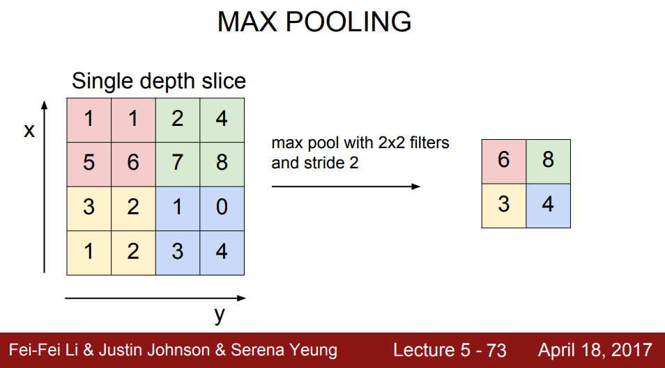 MaxPooling은 각 구역에서 가장 큰 값들만 뽑아내어 새로운 출력을 만드는 것이다. Pooling에서도 필터가 등장하는데, 필터가 움직이면서 필터 영역 내에서 가장 큰 값을 출력하게 된다. 이 때, 보통 stride는 필터의 사이즈를 따른다. 즉 중복되는 픽셀이 없도록 조정된다.