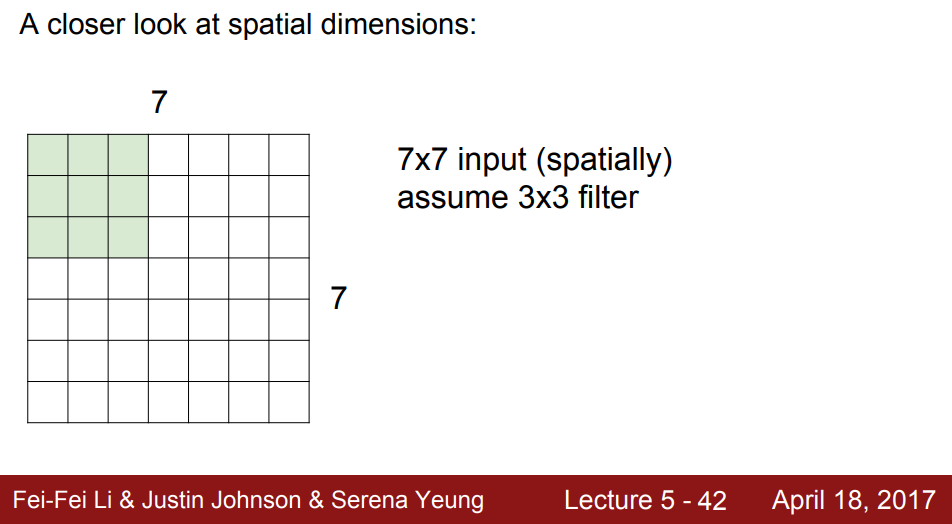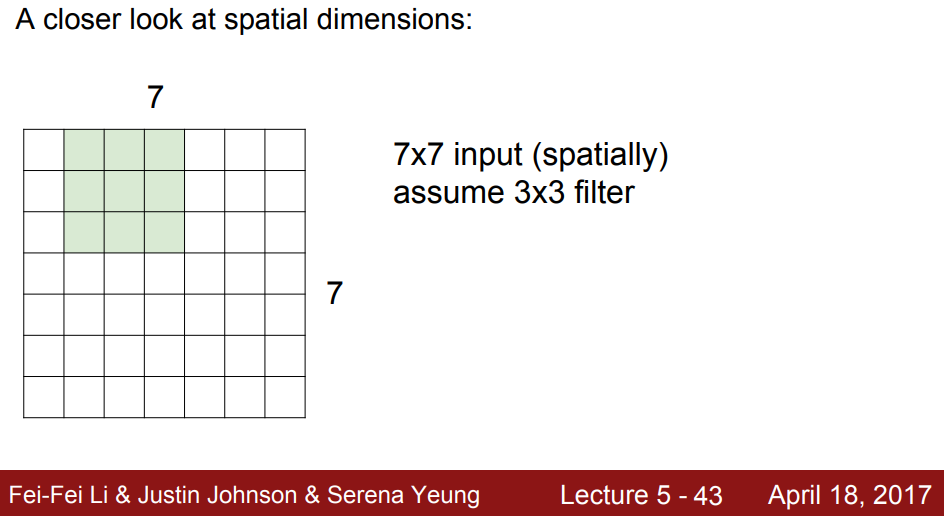 이제 필터가 어떻게 움직이는지를 알아보자. 위 예시는 7x7 input image에 3x3필터를 적용했을 때의 예시이다. 이를 Stride=1로 설정하고 다음으로 움직이면