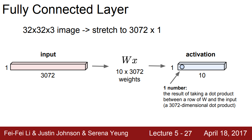 Fully Connect Layer(이하 FC layer)는 보통 CNN 모델들의 마지막 분류기에서 사용된다. 보통 W라는 가중치에서 한 줄의 원소들이 모두 input 원소들과 곱해져 하나의 activation 노드를 형성하기 때문에 Fully-Connected(모두 연결된)이라는 용어를 쓰는 것 같다. W라는 가중치는 input -> output으로 만들어주므로 당연히 그 사이즈는 (inputSize x outputSize) 이다. 이를 통해, activation 노드 하나는 W의 특정한 가중치를 통해 input 전체를 본다고 할 수 있겠다.