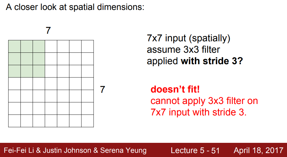 Stride=3이면 1~3행, 4~6행은 필터가 관찰할 수 있지만, 7행부터는 image size의 제한 때문에 그 너머로 움직일 수 없다. 따라서 7x7 input image에 3x3필터와 stride=3을 적용할 수는 없는 것이다.(공백이 생기므로)