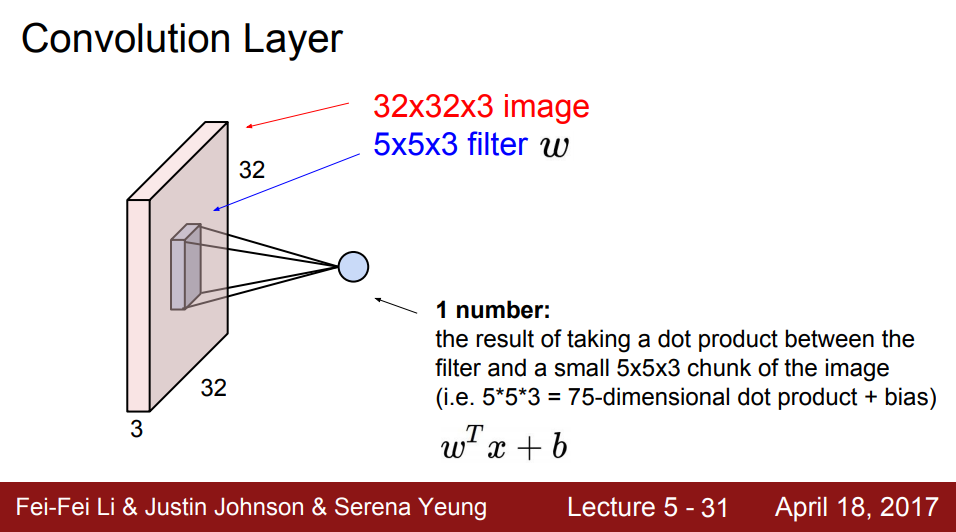 Convolution Layer는 한 이미지를 필터들을 통해 연산을 하여 output을 출력하는 층이다. 위 예시에서는 높이=32, 너비=32, 깊이(depth)=3인 이미지와, 높이=5, 너비=5, 깊이=3인 필터를 예시로 든다. 이 때, 필터의 깊이 = 이미지의 깊이 임을 주목하자. 즉 필터는 한 번에 모든 깊이를 보면서 돌아야 하기 때문에, 서로의 깊이가 같아야 하는 것이다.