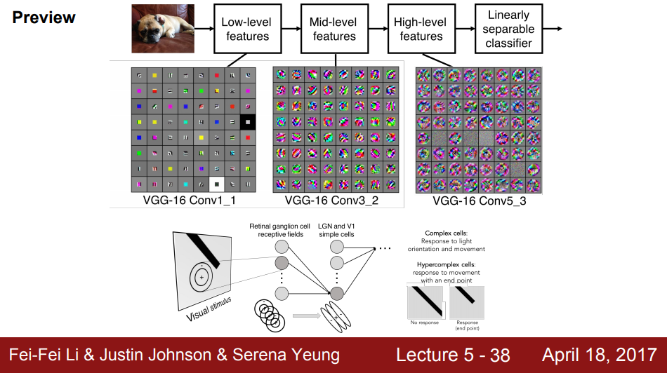 위 슬라이드에서는 각 layer의 filter들 마다 어떤 feature들을 잡아내는지를 보여준다. 보면 알 수 있듯이, 각 필터들은 서로 다른 특징들을 추출해내며, layer가 깊어질 수록 더 추상적이고 high-level feature들을 추출해낸다.