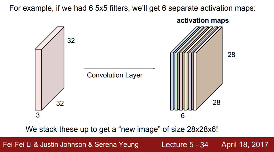 우측에 보이는 6겹의 activation map들 중 한 겹이 우리가 위에서 구한 하나의 activaiton map이다. 하나의 필터로 activation map 하나를 구했으므로, 사용하는 필터의 개수에 따라 출력하는 activation map의 개수가 달라진다는 것을 알 수 있다. 즉 필터의 개수 = activation map 개수 인 것이다. 이렇게 구한 activation map들의 한 덩어리가 output이 되어 새로운 이미지가 된다. 이를 다음 레이어에 전달하기까지가 Convolution layer의 역할이다.