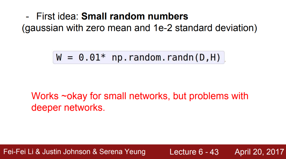 이런 식으로 무작위으 작은 수로 초기화하는 방법도 생각해볼 수 있다. 그러나 이경우 얕은 네트워크에서는 작동하지만, 네트워크가 깊어질수록 작동하지 않는다.
