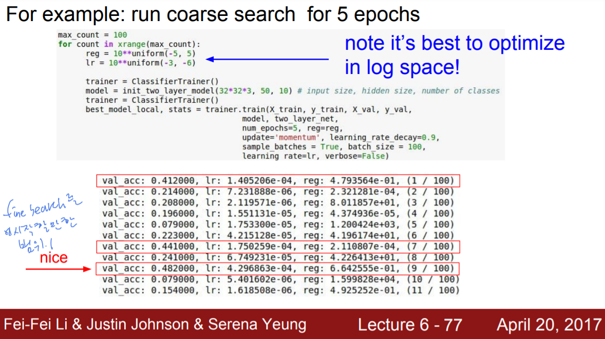 이후 조금씩 좁게 들어가면서 파라미터를 수정한다(finer search) (좁은 범위)