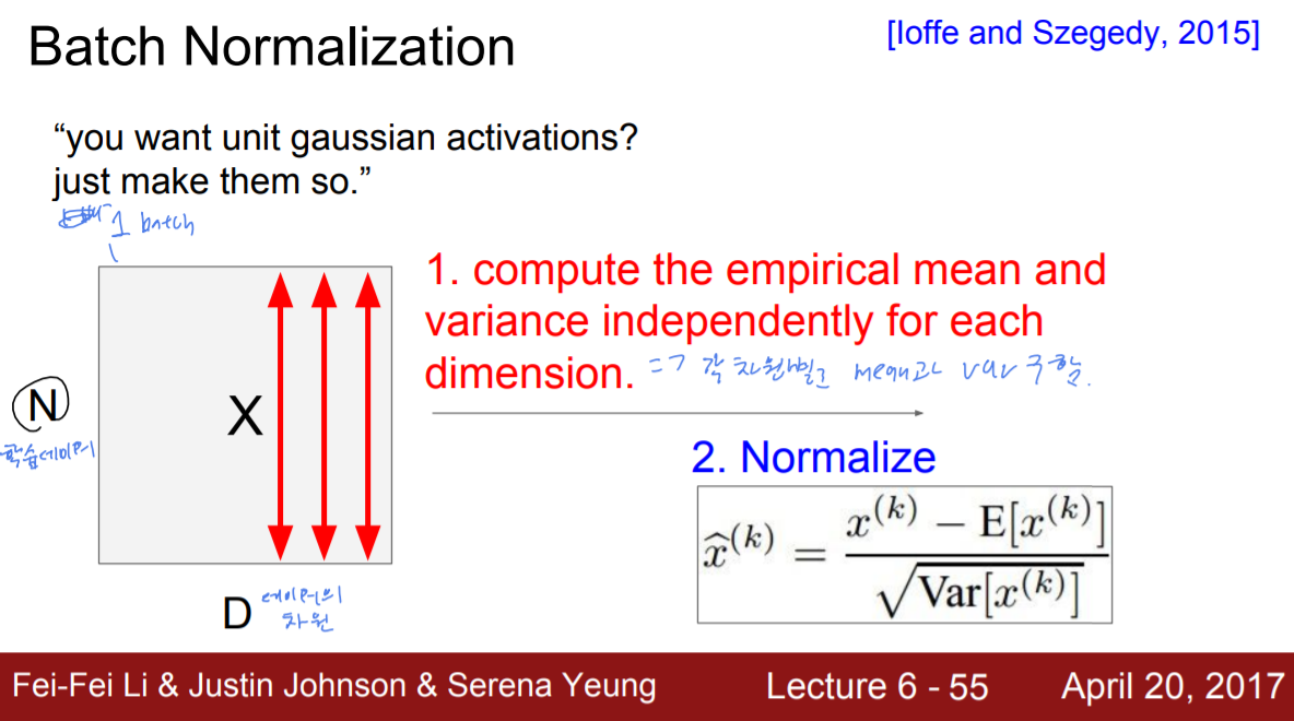 데이터를 zero-centered, normalize해준다(image의 경우 normalize 필요 x)