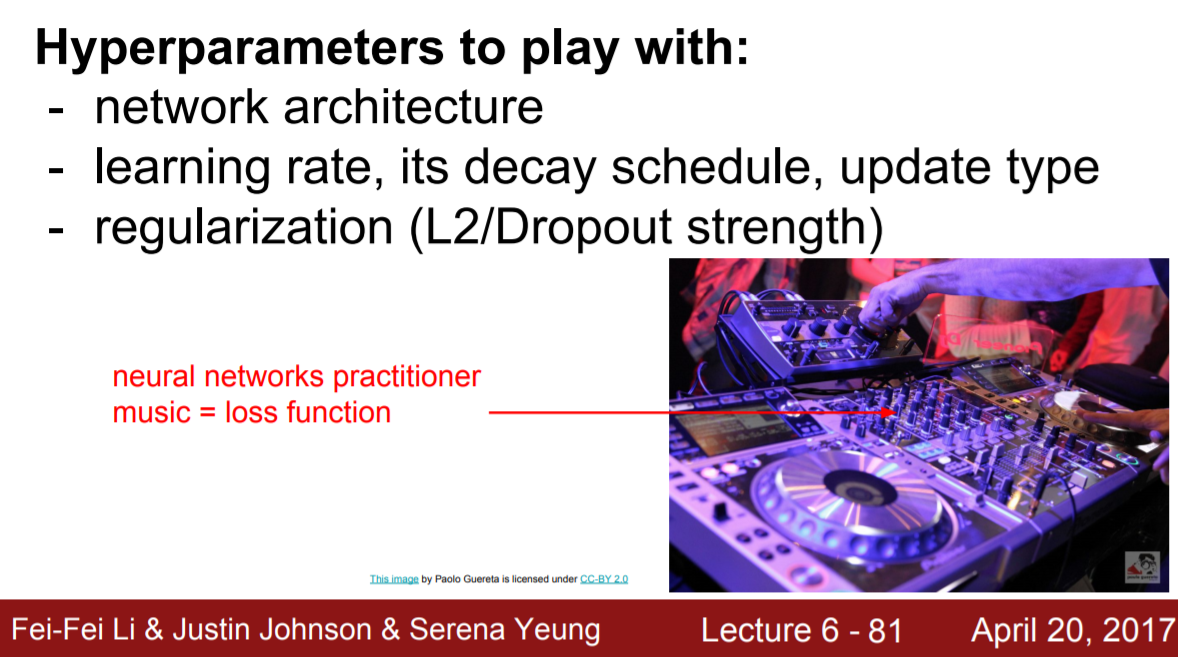 이 외에도, 설정할 수 있는 하이퍼파라미터에는 네트워크 구조, leraning rate, decay schedule(Learning rate 감소 기법), uddate type, regularization 등이 있다.