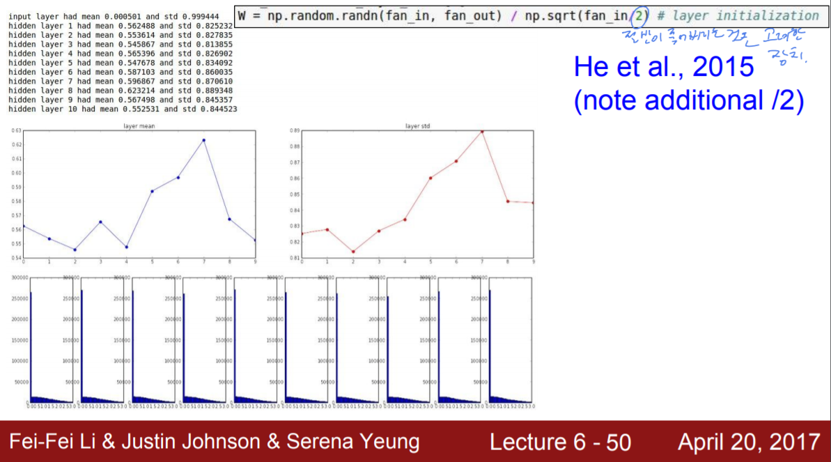 다만 ReLU의 경우, 이론상 출력의 반이 0으로 죽어버리므로, 이를 보완하기 위하여 마지막 나누는 부분에 /2를 더해준다.