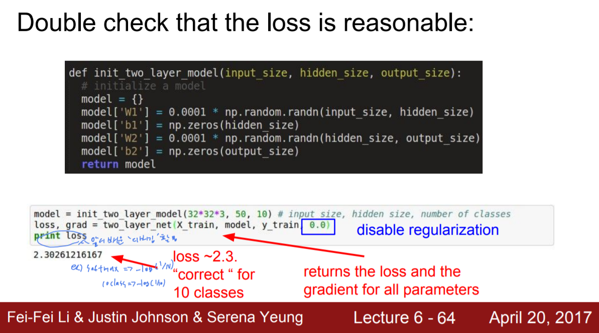 Softmax의 경우 초기 loss= -log(1/class수) 여야 한다.