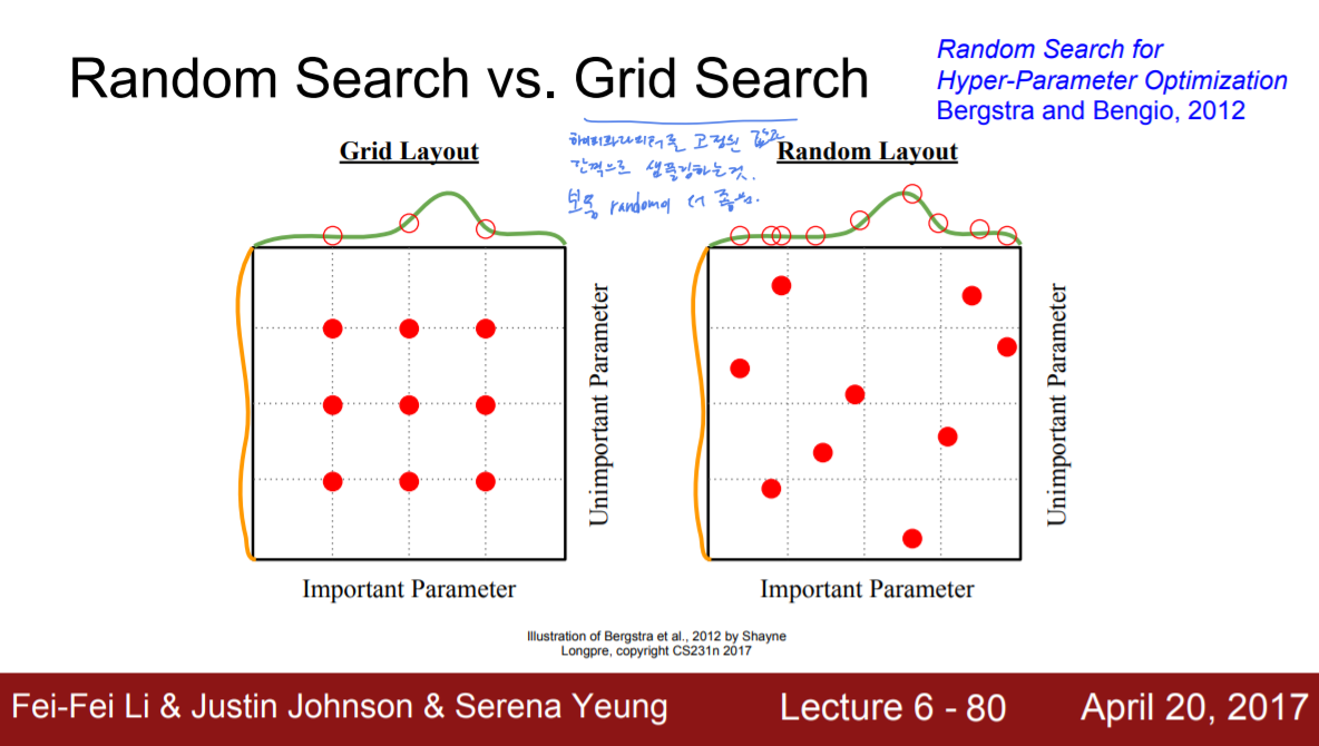 finer search에는 보통 2가지, Random search와 Grid search가 있는데 일반적으로 Random Search가 더 좋다. 왜냐하면 Random Search는 여러 방면으로 시도해볼 수 있는 기회가 생기는 반면 Grid search는 고정되어 있기 때문에 정답쪽의 방향이 있음에도 적은 횟수만 시도가 가능하다.