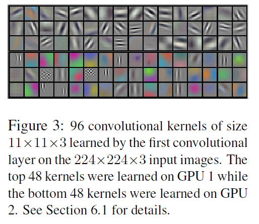 이는 첫 번째 레이어에서 나타난 feature map인데, 위 3줄은 첫 번째 GPU에서, 아래 3줄은 두 번째 GPU에서 나타나는 모습이다. 첫 번째 GPU에서는 color가 거의 인코딩되어 있지 않지만, 두 번째 GPU에서는 color가 인코딩되어 있는 모습을 볼 수 있다.