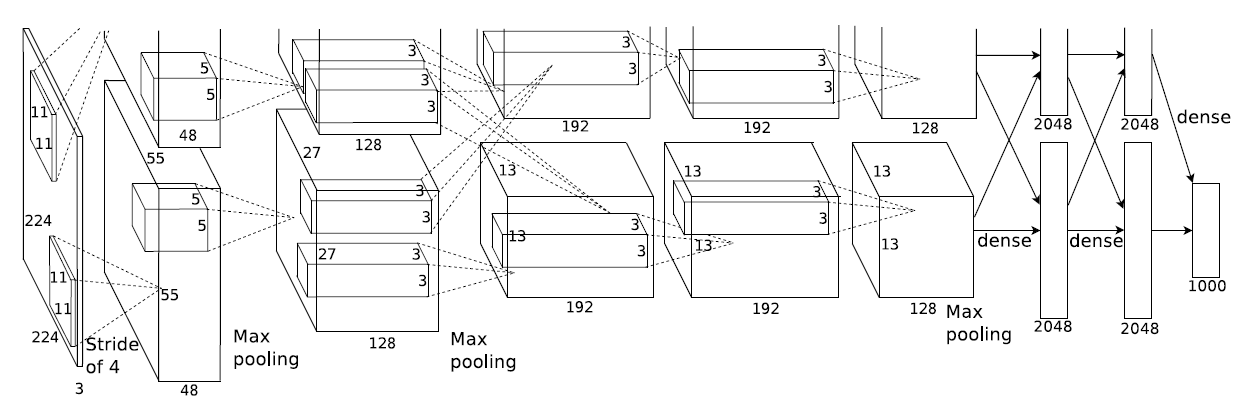 첫 번째 레이어는 224x224x3 이지미를 입력받으며 이를 11x11x3의 96개의 kernel(filter)과 4-stride로 연산한다. 두 번째 레이어는 첫 번째 레이어의 출력결과가 LRN과 MaxPooling을 거쳐 나온 결과물을 입력으로 받으며, 5x5x48 크기의 256개의 필터가 이를 연산한다. 나머지 3, 4, 5번째 Layer들은 서로간에 연결될 때(3->4, 4->5) 특별한 pooling이나 normalization이 사용되지 않았다. 3번째 Layer는 이전 레이어의 출력 결과가 LRN과 MaxPooling을 거친 결과물을 입력으로 받고 3x3x256크기의 384개의 필터가 연산한다. 4번째 Layer는 3x3x192크기의 필터 384개가 연산하며, 5번째 Layer는 3x3x192 크기의 필터 256개가 연산한다. 마지막으로 FC Layer들은 모두 4096개의 뉴런으로 구성되어 있다.