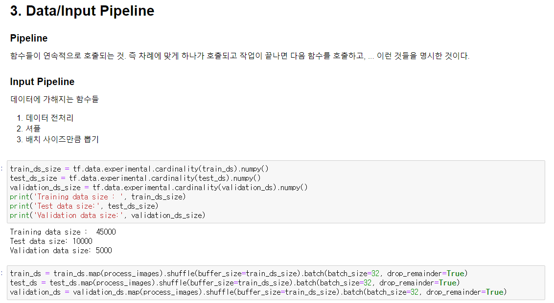 Input pipeline에는 [데이터 전처리, 셔플, 배치사이즈만큼 뽑기] 의 작업들이 들어간다