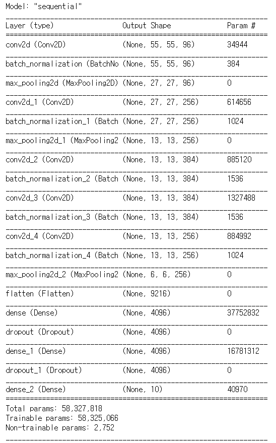 - MaxPooling 시 OverlapPooling을 사용한다! => pool_size=(3,3), strides=(2,2)