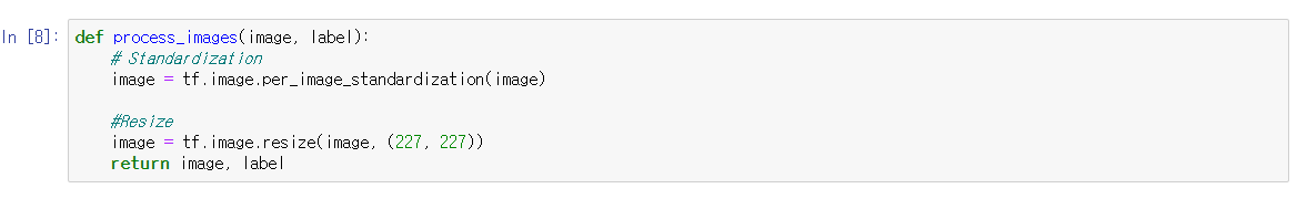 그리고나서, 이미지를 standardize해주고, 이미지 사이즈를 32x32 에서 AlexNet이 사용하는 227x227로 변경해준다.