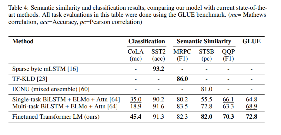 텍스트 분류로 사용한 데이터셋으로는 문법적으로 맞는지를 판단하는 Corpus of Linguistic Acceptability(CoLA)와 단순히 이진분로 사용되는 Stanford Sentiment Treebank(SST-2)가 있다. CoLA에서는 기존 성능과 비교했을 때 큰 성능 향상을 이루었으며, SST2는 SOTA와 맞먹는 성능을 발휘했다.
