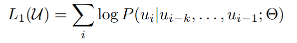 비지도 말뭉치의 토큰들 u={u_1, u_2, ... ,u_n} 이 주어졌을 때, 아래 우도를 최대화하는 방향으로 표준 언어 모델링 목적함수를 사용한다.