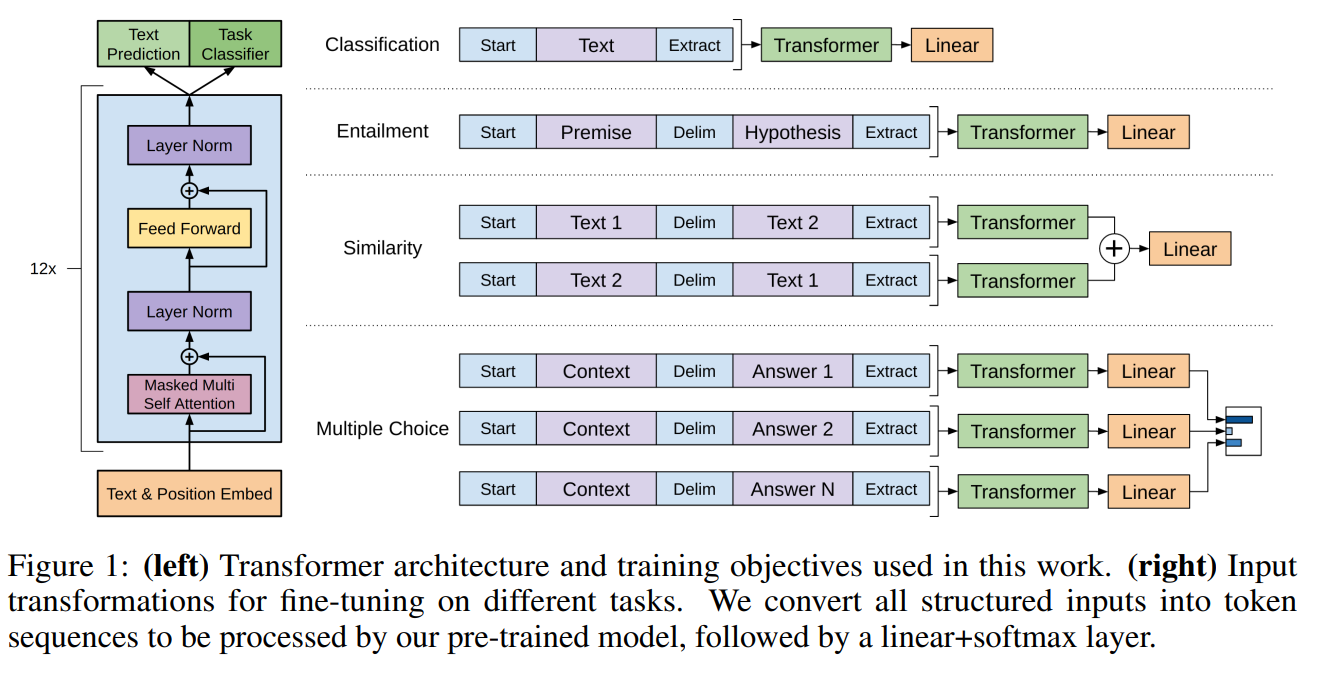 - 모델 구조로는 Transformer를 사용하며, language model 에서 fine-tuning으로 넘어가는 시점에서 language model의 출력을 원하는 작업에 맞는 input으로 변형하여 넘겨준다.