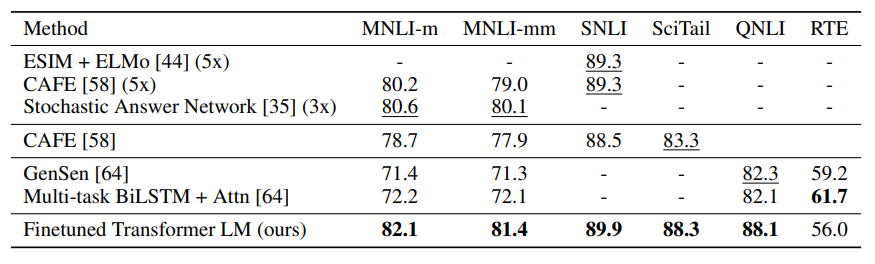 여기서는 생성적 사전학습과 미세조정을 통해 만들어진, "작업에 대한 지식이 없는", 자연어를 이해하는 것에 강한 framework를 소개했다. 광범위한 정보를 담는 연속된 텍스트로 이루어진 다양한 말뭉치들로 사전학습된 모델은 상당한 일반 지식(world knowledge)과 넓은 범위의 정보 처리가 가능한 기능을 얻었는데, 이는 QA, 의미적 유사도 평가, entailment determination, 텍스트 분류와 같은 작업들에 맞게 성공적으로 전이되었으며, 12개의 데이터셋 중 9개에서 SOTA를 달성하였다. 특화된 작업의 성능 부스트를 위한 비지도 사전학습은 오랫동안 기계학습 연구의 중요한 목적이였다. 우리의 작업은 이 분야에서 상당한 성능 향상도 가능하고, 어떤 모델(Transformer)과 데이터셋(긴 범위에 대한 의존성이 존재하는 텍스트) 이 가장 좋은지에 대한 힌트도 준다. 이 연구가 새로운 비지도 학습 연구를 도와주기를 바라며, 더 나아가 비지도 학습이 어떻게, 그리고 언제 발생하는지에 대한 이해를 돕는 것에도 도움이 되기를 바란다.