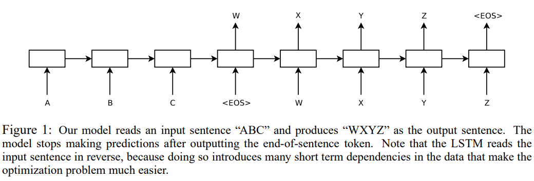 가변 길이의 벡터를 사용하기 위해 논문은 LSTM 하나를 사용하여 입력 시퀀스를 입력으로 받고 고정된 차원의 벡터를 출력한다. 그리고 또 하나의 LSTM을 사용하는데, 이는 이전 LSTM에서 출력된 벡터를 입력으로 받아 출력 시퀀스를 생성한다. 여기서 입력으로 사용된다는 말은 두 번째 LSTM의 초기 hidden state로 사용된다는 것을 의미한다.